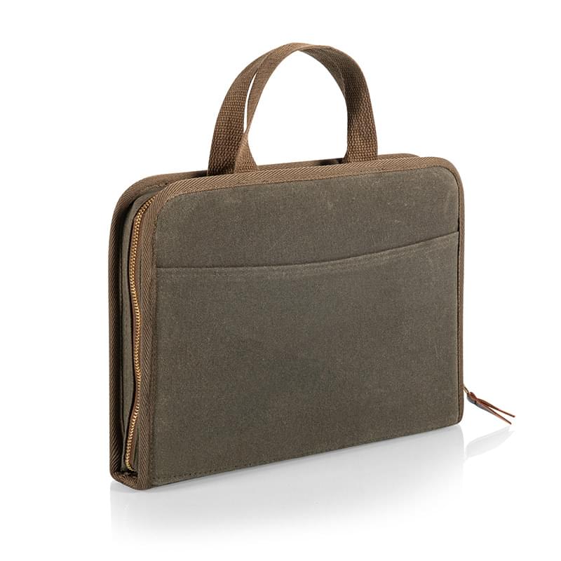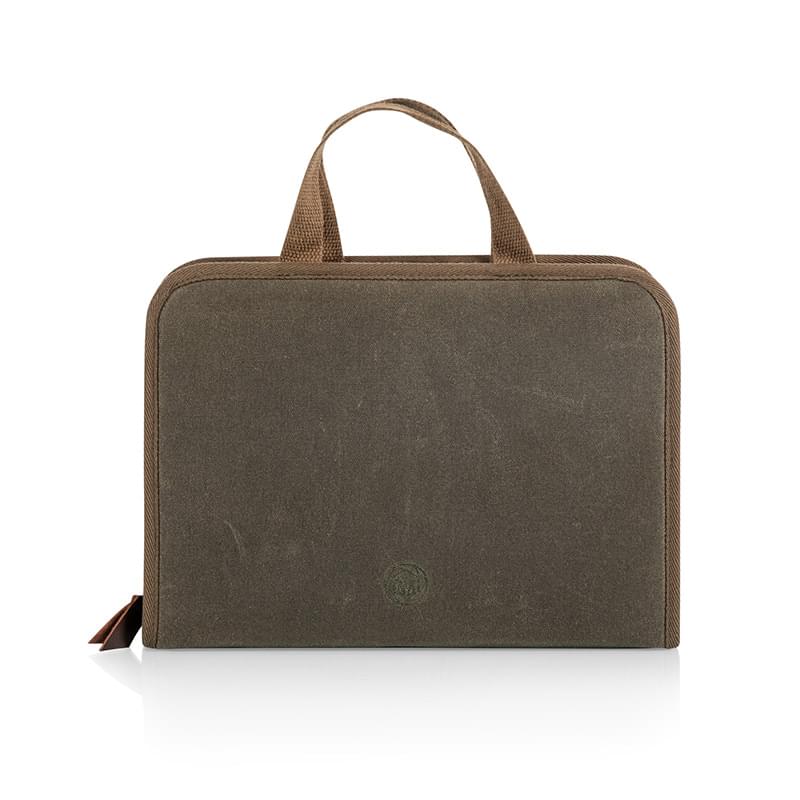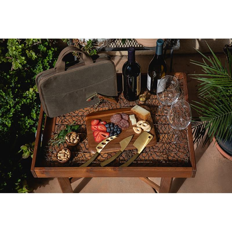Features: Waxed Canvas case with cotton webbing handles; Large front pocket and satin brass-toned zipper; Inside pockets on one side contain solid satin brass-toned cheese and wine tools; cheese cleaver, forked cheese knife, parmesan knife, Waiter-style corkscrew with wood handle, and bottle stopper; Other side has an angled pocket with an Acacia serving board
